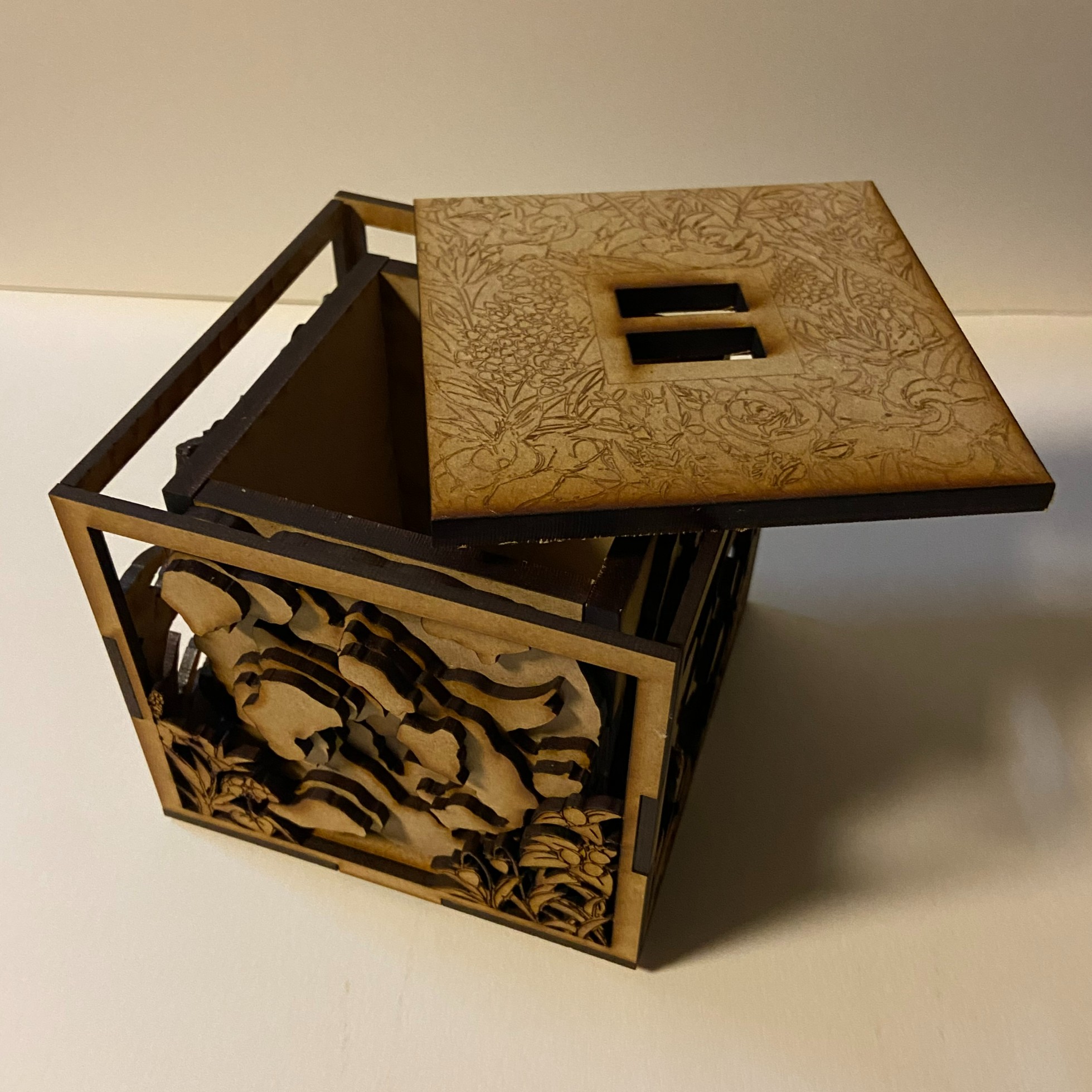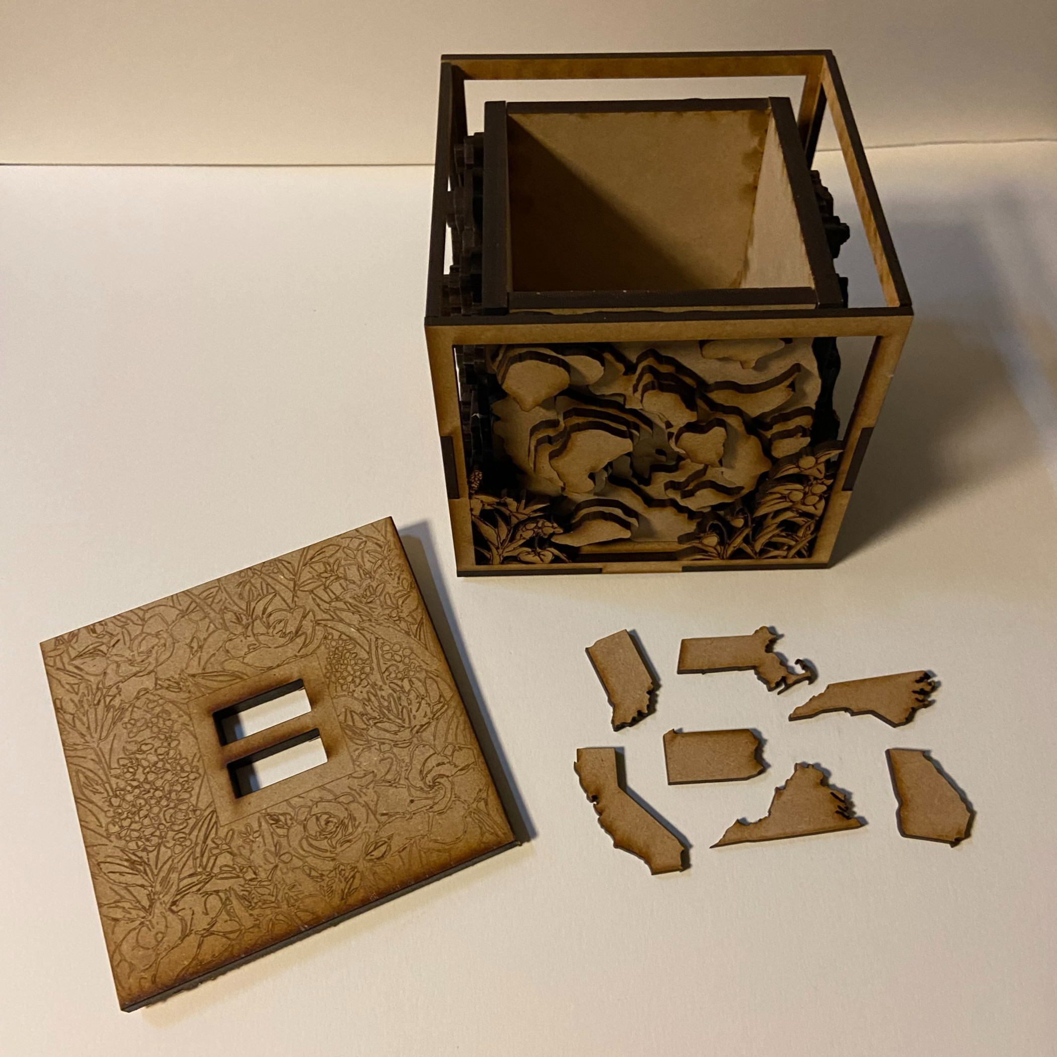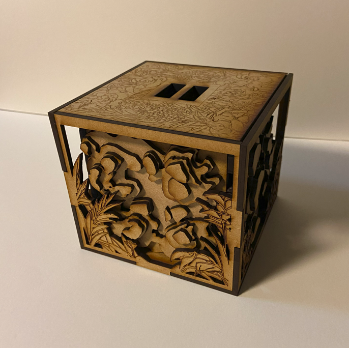 Designed and prototyped box design in Tinkercad ✦ Hand drew flower and foliage designs for lid and sides of box ✦ Drew out topographic game map layers in Procreate ✦ Converted drawings into vector tracings in Illustrator ✦ Laser cut pieces and assembled final iteration